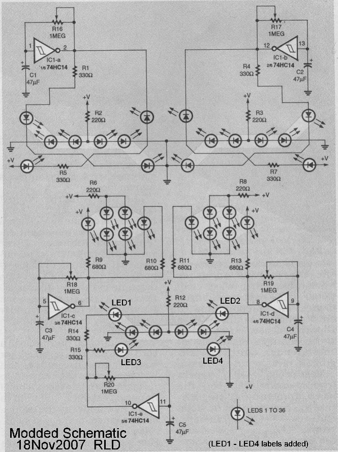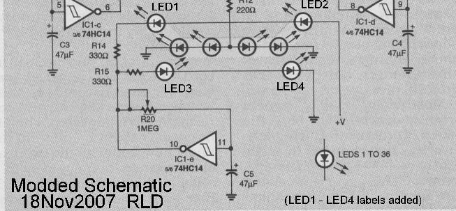 | This is the mouth section of the original schematic as it was published. I have labeled the LEDs I am working with LED1-LED4. Mostly frowning.