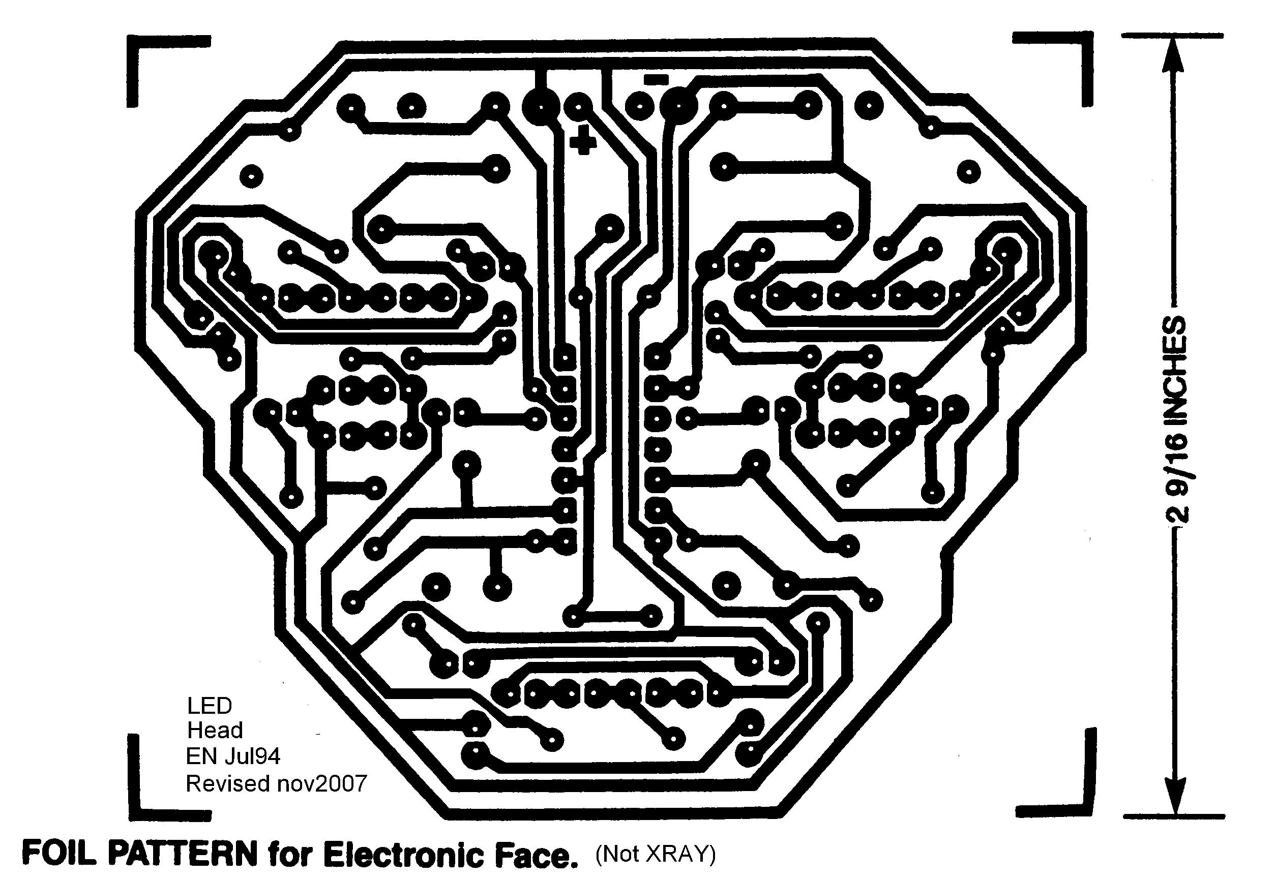 | Unfortunately, it does not match the printed PCB. Probably due to magazine editing. So I've adjusted the schematic to match the pcb that was published in the magazine(resistor placement, LED direction, power). For the Mouth area only. Mostly frowning.