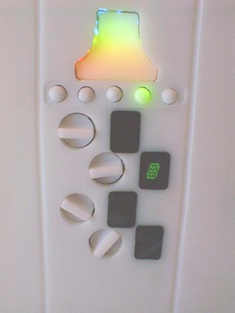 A close up showing the displays and controls. One alpha numeric displayed is wired so all digits light.