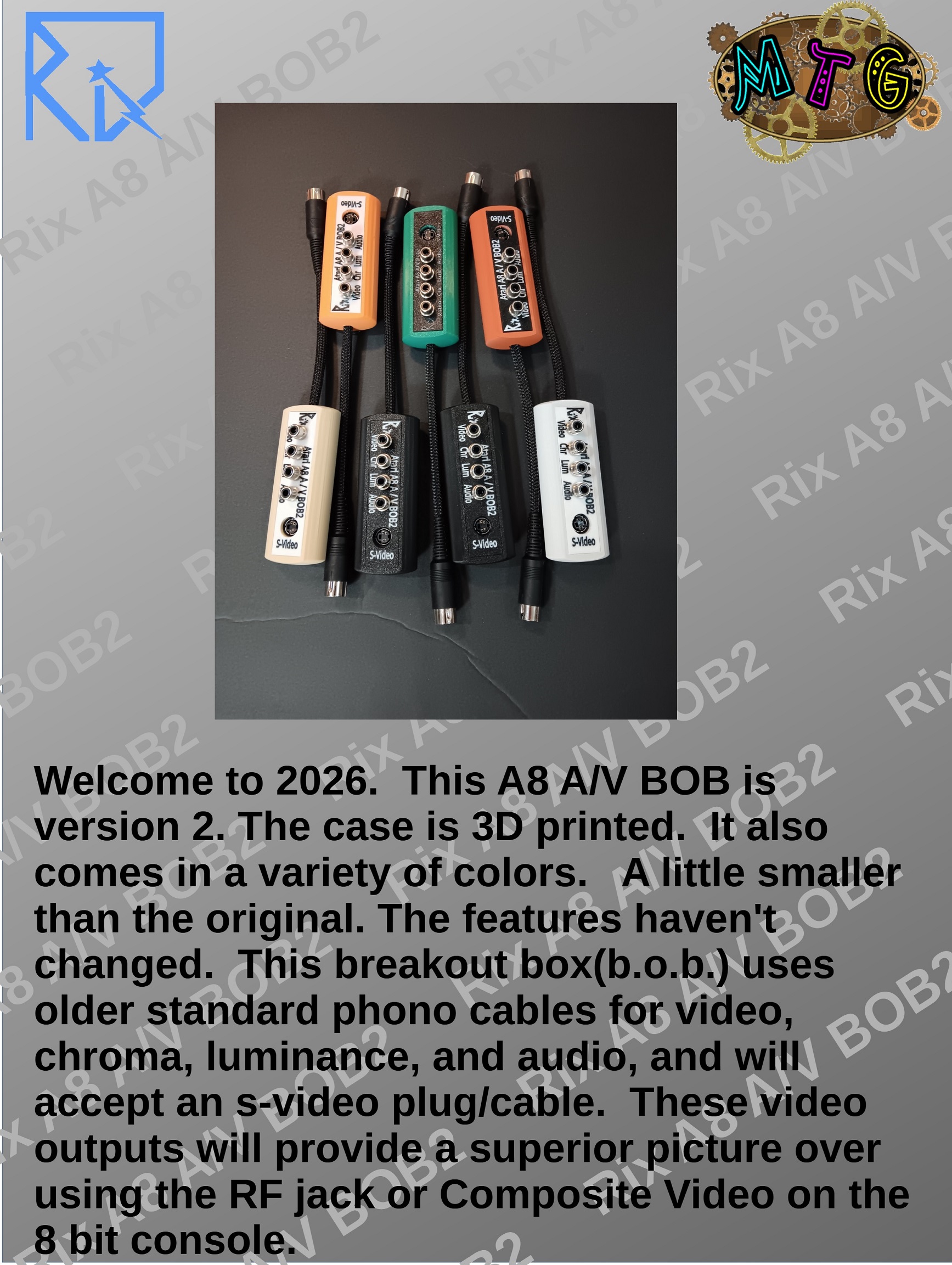 MORE NOTES For the phono cables, hold the b.o.b. and push in the cables with a slight twist. Remove with a slight twist as well. Use care to hold the s-video cable the right way, usually with the flat side up(towards the label). For longer distances, higher quality cables are recommended. The 8 bit monitor plug inserts into the jack (on the right side or center back) with the 5 pins at the bottom. Note that some 8 bit models do not have monitor jacks. And some with the jacks do not have the chroma line connected. Testing has shown that a short jumper between the video and chroma jacks will provide a signal suitable for s-video, although of lower quality than using an actual chroma signal. Also, this b.o.b. will NOT provide RGB or VGA signals. These signals are not present on the 8 bit monitor jack. THERE IS A LIMITED WARRANTY ON THE PRODUCT THEMSELVES, NOT ON ANY DAMAGED CAUSED BY THE USER OR THE PRODUCT. IF YOU HAVE ANY PROBLEMS, CONTACT US. Please ask FIRST: Shipping elsewhere, Adding Insurance, Multiple items, Questions. Get info BEFORE ordering. All advert pages copyright (C) 2026 More Than Games. We reserve the right to make updates and corrections at any time without liability. |