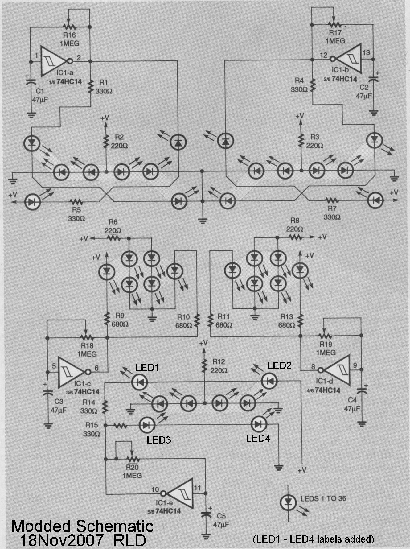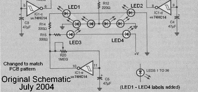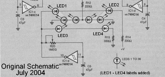 | This is the mouth section of the original schematic as it was published. I have labeled the LEDs I am working with LED1-LED4. Mostly frowning.