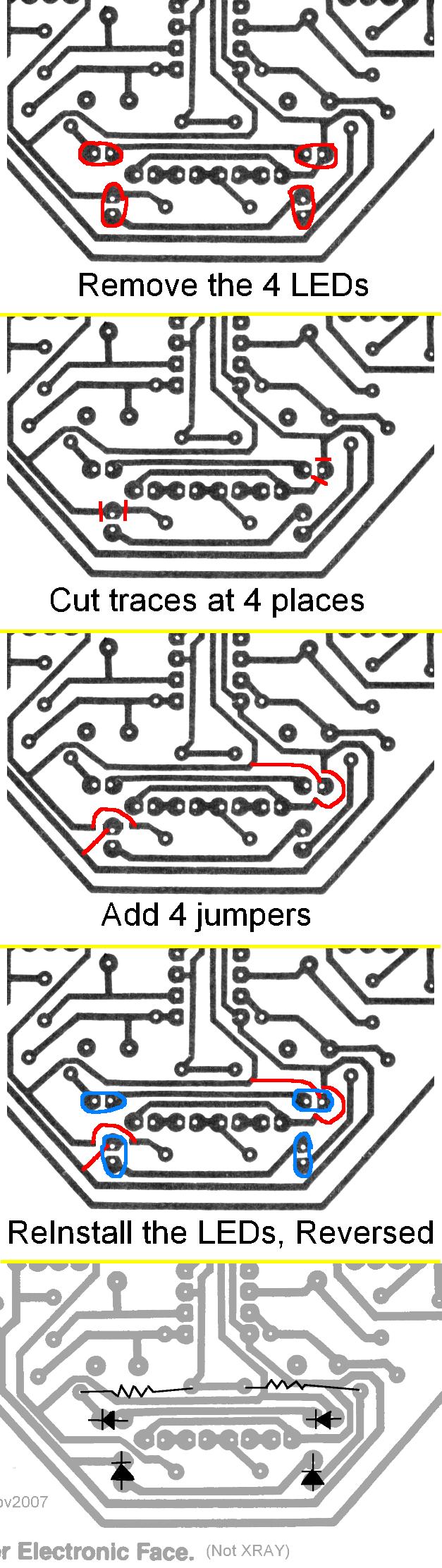 Here are the steps to modifying the old pcb. Images are looking at the foil side. LED1 is on the top right.